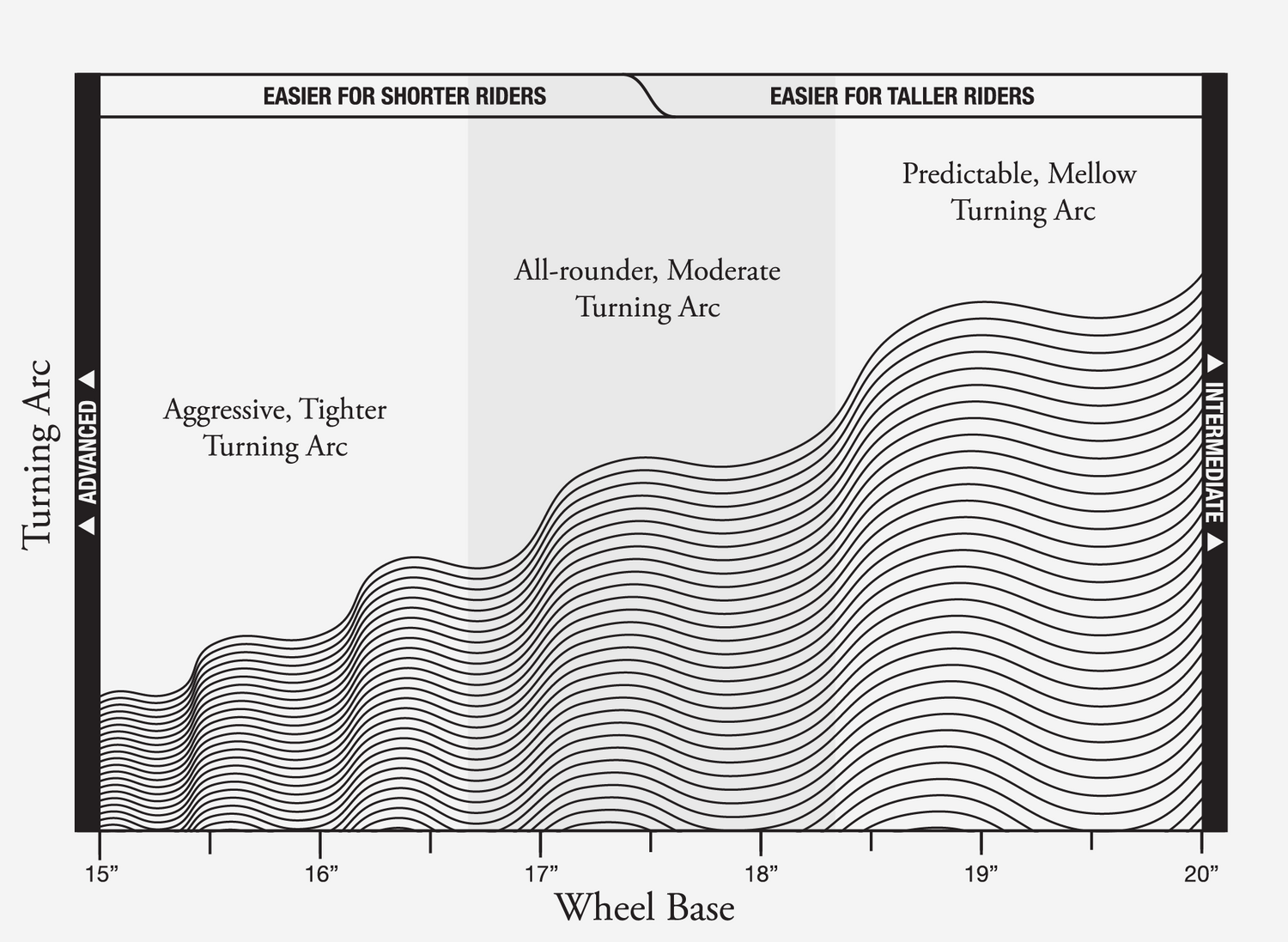 This general guide can help you choose a Surf/Skate based on the style of performance you’re after. Shorter wheelbase boards have a tighter turning arc, and a sharper pivot; more advanced riders will feel a high performance edge riding a board with a shorter wheelbase. A longer wheelbase board will have a mellower turning arc; beginner/intermediate riders will feel comfortable with the flowy, drawn-out turns akin to a longer surfboard.