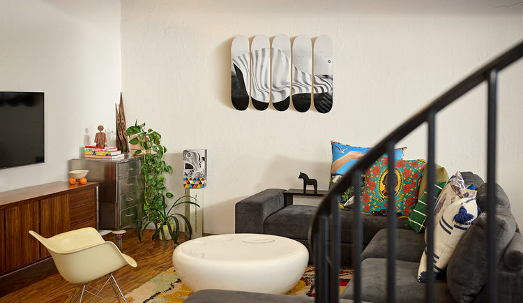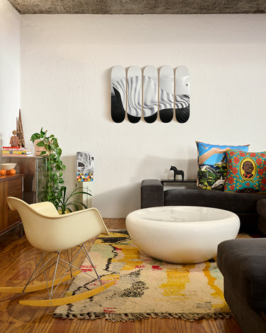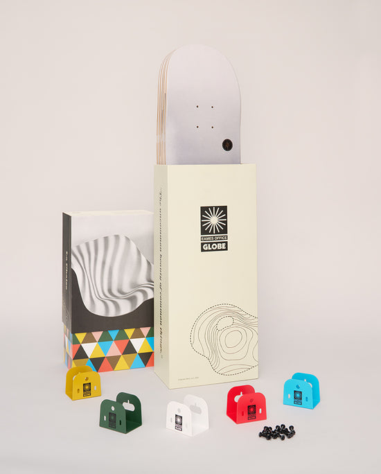 Limited edition boxed set of Eames Office + Globe skateboards featuring a striking abstract image of the development of La Chaise, originally created for MoMA's 1948 Low Cost Furniture Competition, that we as skateboarders see as something that would be pretty appealing to skate. The set of 5 decks includes easy to mount hardware so the series hangs as one image over 5 boards.