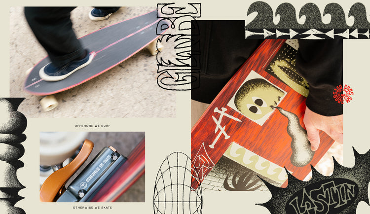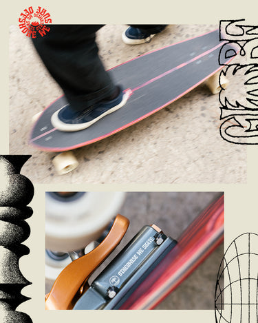 Medium-length surf inspired swallow-tail cruiser with Slant surf/skate trucks for a surf-like carving experience. Longer in length with a fairly long wheelbase, the Chromantic set up as a surf/skate board offers a stable, easy flowing surf-like carving experience. It’s a great board choice for beginner to intermediate surf/skate riders and larger riders. With the sure footing of its 65mm conical wheels and mellow deck concave it makes wider predictable turns, but the swallow tail adds a nice playful punch. The deck features lo-fi art by Max Loeffler over dye washed maple veneers.