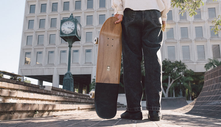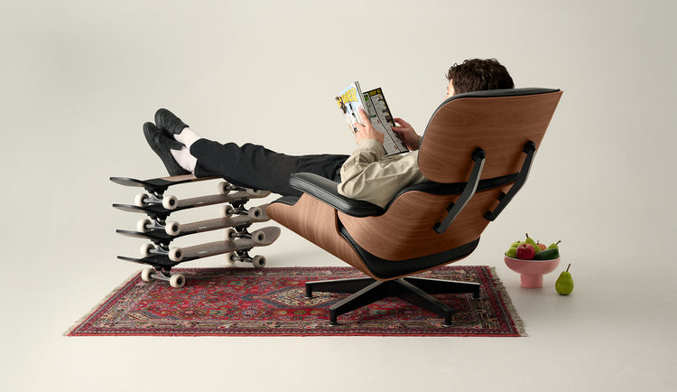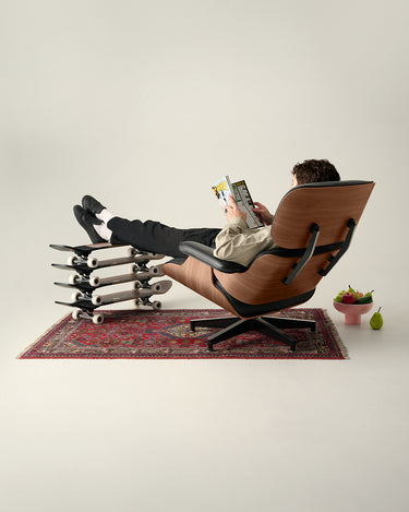 A skateable cruiserboard methodically detailed in resemblance of the famous Eames Lounge Chair and Ottoman. The Eames Lounge Cruiser in Walnut/Black is a Walnut and Canadian maple deck with mellow concave, a steep nose and tail kick. It features custom Eames Office + Globe details with embedded metal badges and deck bolts with the Eames logo. The board has design details throughout matched to the Lounge chair.